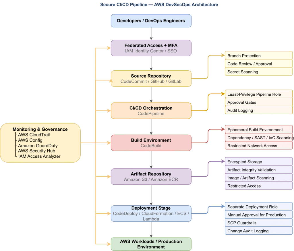 A secure pipeline architecture separates responsibilities between development, build, artifact management, and deployment stages while enforcing identity controls, governance guardrails, and continuous monitoring. This approach reduces the risk that a compromise in one stage of the pipeline will impact the entire environment.